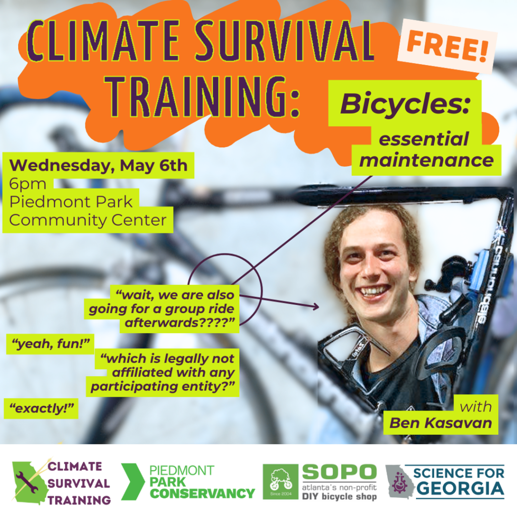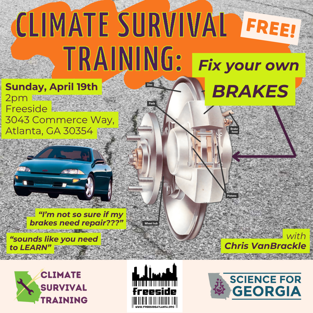 Learn with Chris VanBrackle how to change the brakes on a car safely! Its easier that you think! This hands-on class fits with a theme of community resilience and autonomy education and we may spend some time talking about that stuff more broadly too. Given all that, it is really no surprise that this is a collaboration with the Climate Survival Training series from Science for Georgia.