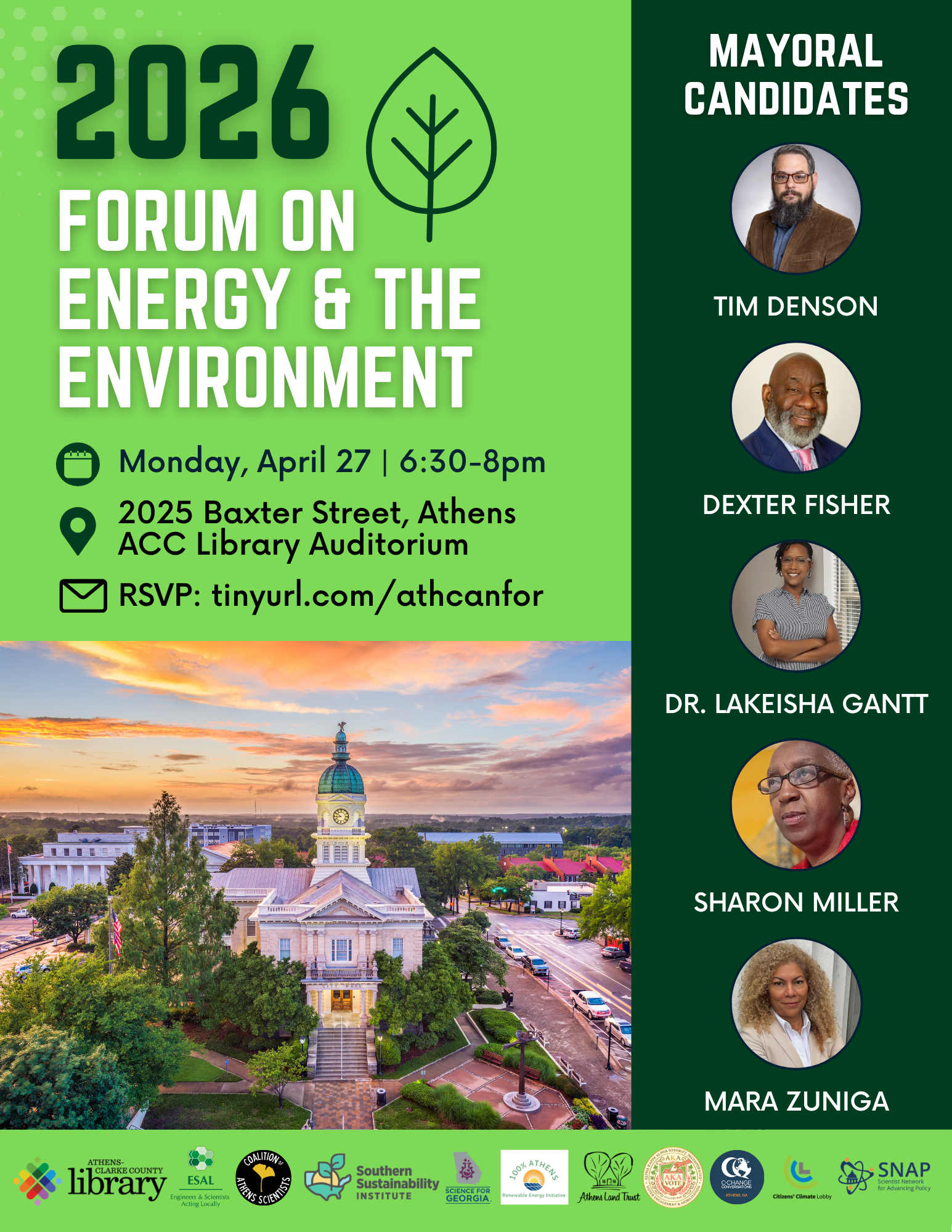 Date: 04/27/2026 Time: 6:30pm Location: ACC Library Auditorium - 2025 Baxter St, Athens, GA Join your community for this Non-partisan mayoral candidate forum on local issues related to energy and…