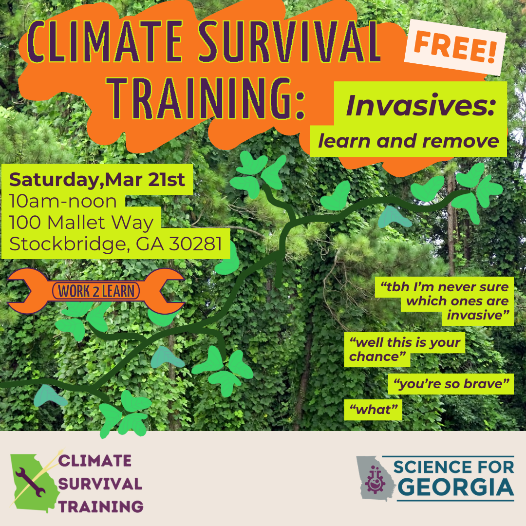 Work2Learn: Invasives - Identify and Remove Date: Saturday, March 21st Time: 10am-12pm Location: 100 Mallet Way, Stockbridge, Ga 30281 Come learn with Chris about invasives and help actually remove…